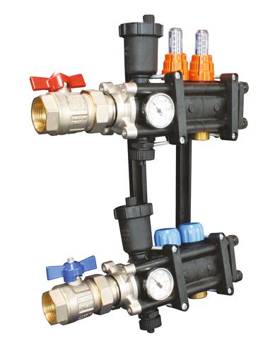 - Composition de l'ensemble : 2 collecteurs pré-assemblés débitmètres intégrés, purgeurs, vidanges et thermomètres, 2 supports doubles, 2 vannes à boisseau sphérique M33/42 F26/34 avec manette papillon bleue et rouge, 2 raccords 2 pièces auto-étanches EP33/42 M26/34.