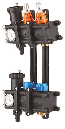 - Fourni pré-assemblé sur support double, équipé d'un fluxmètre sur le collecteur de refoulement et d'inserts thermostatisables sur le collecteur de retour.