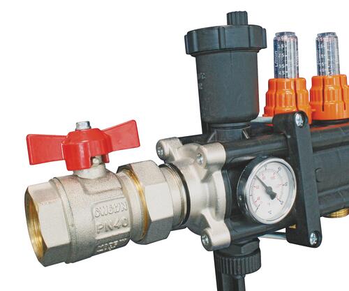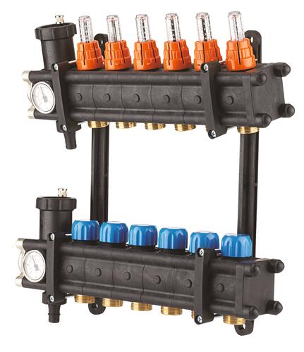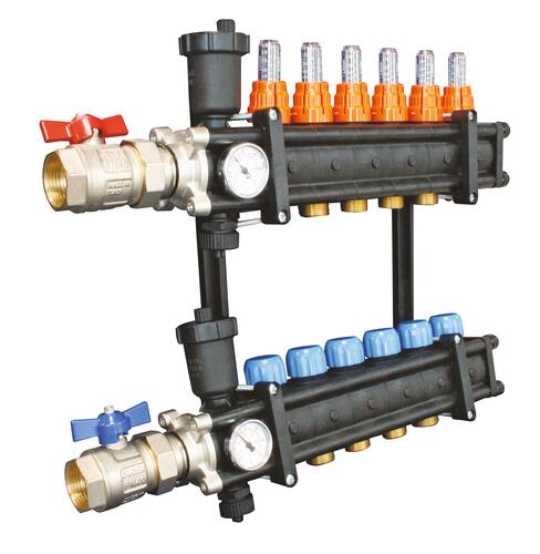 - Composition de l'ensemble : 2 collecteurs pré-assemblés débitmètres intégrés, purgeurs, vidanges et thermomètres, 2 supports doubles, 2 vannes à boisseau sphérique M1"1/4 F1" avec manette