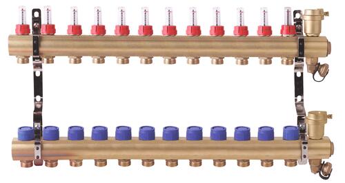 - Collecteur laiton pour plancher chauffant livré pré-monté avec supports de fixation, purgeurs d'air automatiques et débimètres.