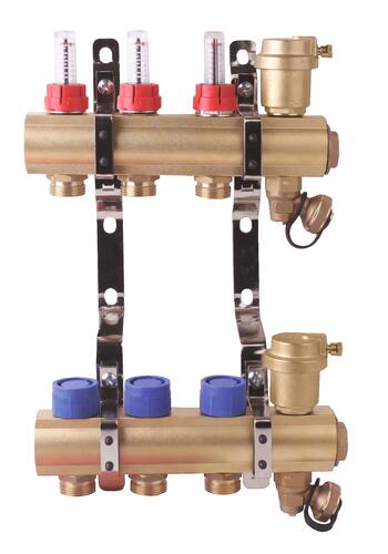 - Collecteur laiton pour plancher chauffant livré pré-monté avec supports de fixation, purgeurs d'air automatiques et débimètres.