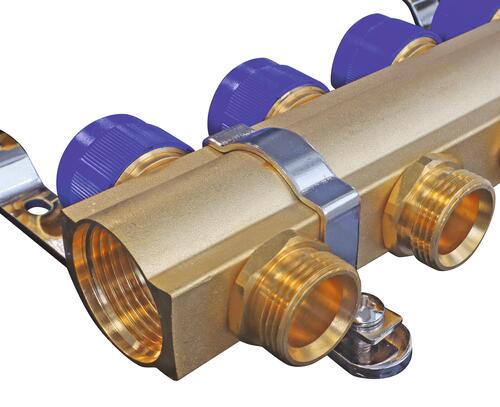 - Collecteur laiton pour plancher chauffant livré pré-monté avec supports de fixation, purgeurs d'air automatiques et débimètres.