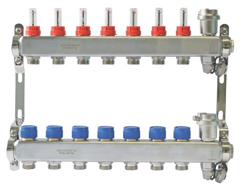 - Collecteur inox pour plancher chauffant livré pré-monté avec supports de fixation, purgeurs d'air automatiques et débimètres.