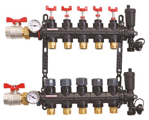 - Collecteur en matériau de synthèse pour plancher chauffant livré pré-monté avec supports de fixation, purgeurs d'air automatiques, débimètres et vannes à sphère droites en laiton nickelé.