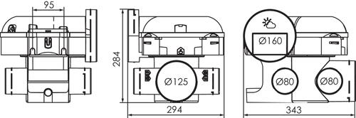 - Groupe combles en matière plastique recyclable avec 1 piquage Ø125 cuisine, 4 piquages Ø80 sanitaires et 1 rejet Ø160/125 grâce à l'adaptateur fourni.