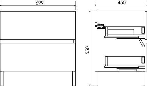 - 2 tiroirs avec glissières invisibles soft close pour une utilisation silencieuse et fluide.