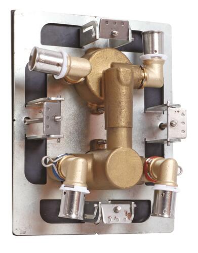 NF et cartouche inverseur 2 voies sur partie haute. Isolation air / eau de l'installation par plaque EPDM. Raccordement par raccords spécifiques à agrafes avec blocage1/4 de tour, 2 entrées (EF