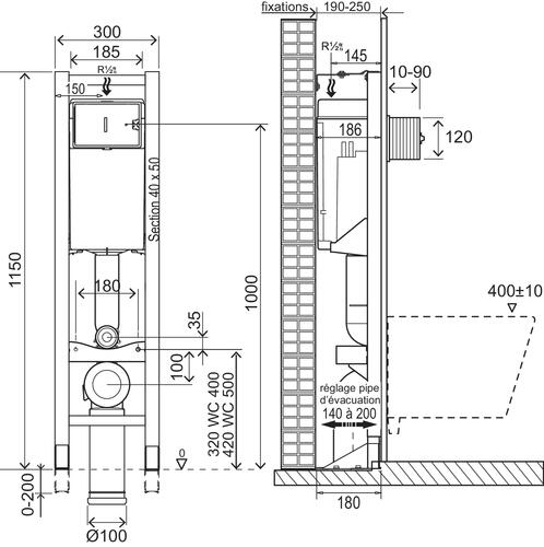 - Evacuation en PVC ø100 mm réglable en profondeur sur 60 mm.