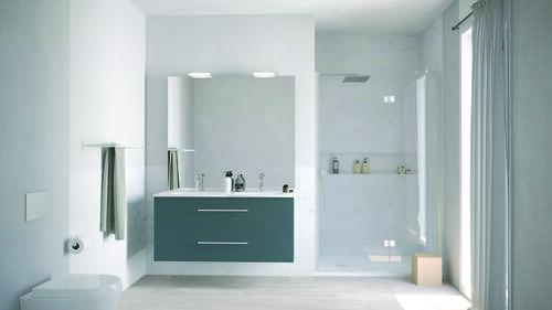 - Livré pré-monté, sans robinetterie, sans vidage, sans plan vasque, sans miroir.