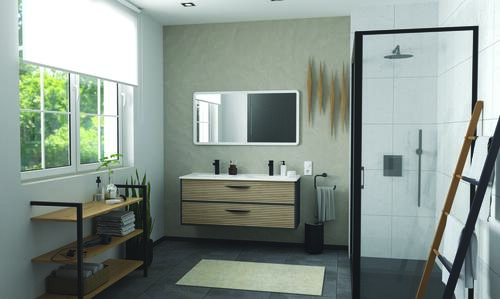 - Livré pré-monté, sans robinetterie, sans visserie de fixation murale, sans vidage, sans plan vasque, sans miroir.