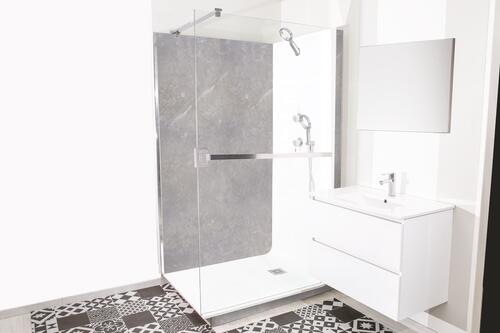 - 1 panneau décor en compact 8 mm résistant aux impacts, aux rayures et aux solvants. 1 paroi en verre SÉCURIT 8 mm traitée anticalcaire sur les 2 faces.