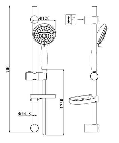 - Barre de douche Ø25 mm, hauteur 70 cm.
