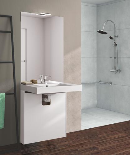 - Façade rentrante épaisseur 16 mm avec découpe siphon, amovible pour accès permanent au vide-sanitaire.