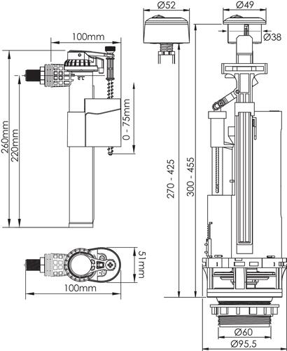 Mécanisme complet à double poussoir à étrier auto-ajustable avec robinet flotteur latéral