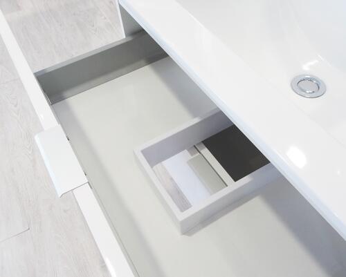 - 2 tiroirs à sortie totale avec poignées fines métal chromé.