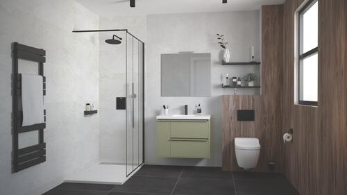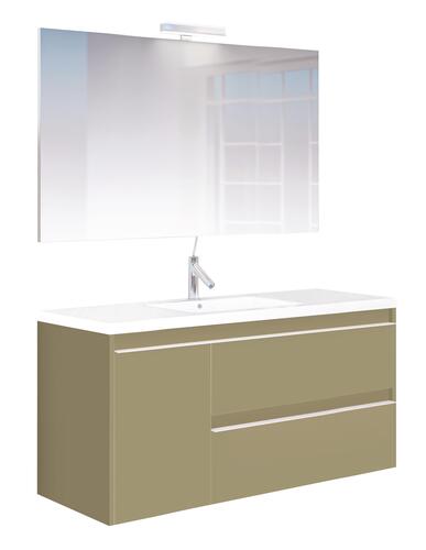 - Meuble à suspendre finition vert menthe, avec plan céramique blanc et vasque intégrée avec trop plein.