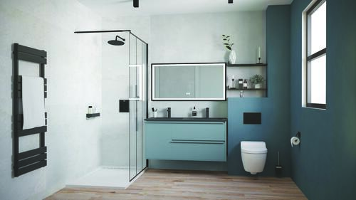 - Meuble à suspendre finition bleu bleuet, avec plan résine noir mat et vasque intégrée avec trop plein.