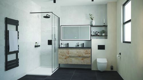- Miroir à suspendre collé sur panneau mélaminé 16 mm avec applique LED classe II IP 44.
