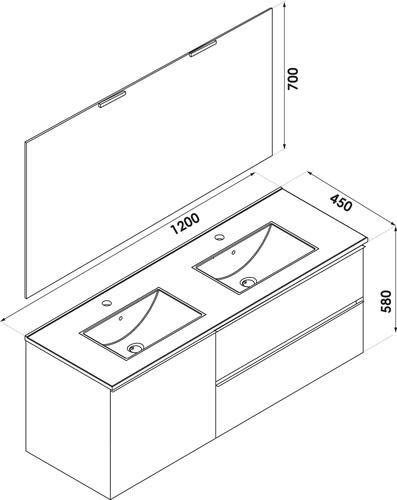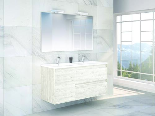 - Meuble à suspendre finition nordic, avec plan céramique blanche deux vasques intégrées avec trop plein.