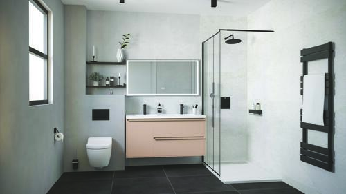 - Meuble à suspendre finition rose poudré, avec plan céramique blanc et vasque intégrée avec trop plein.
