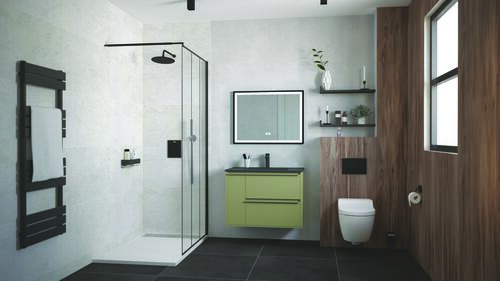 - Meuble à suspendre finition vert menthe, avec plan résine noir mat et vasque intégrée avec trop plein.