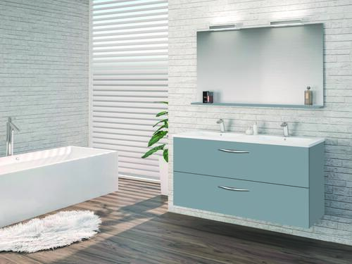 - Meuble à suspendre finition bleu bleuet, avec plan céramique blanche deux vasques intégrées avec trop plein.