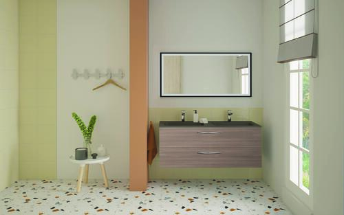 - Meuble à suspendre finition cérusé, avec plan résine noir mat et vasque intégrée avec trop plein.