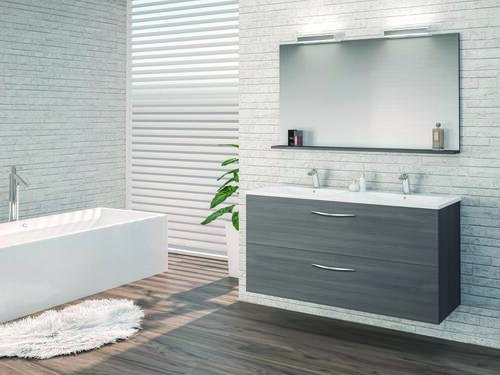 - Meuble à suspendre gris, avec plan céramique blanche deux vasques intégrées avec trop plein.
