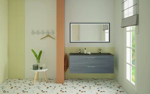 - Meuble à suspendre finition gris, avec plan résine noir mat et vasque intégrée avec trop plein.