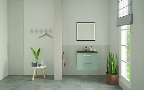 - Meuble à suspendre finition bleu bleuet, avec plan résine noir mat et vasque intégrée avec trop plein.
