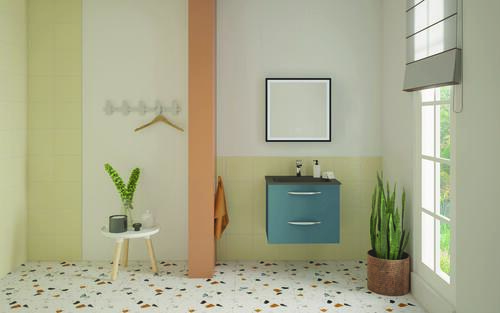 - Meuble à suspendre finition bleu paon, avec plan résine noir mat et vasque intégrée avec trop plein.