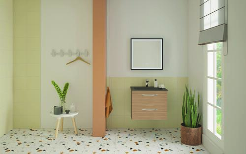 - Meuble à suspendre finition cérusé, avec plan résine noir mat et vasque intégrée avec trop plein.