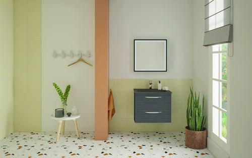 - Meuble à suspendre finition gris, avec plan résine noir mat et vasque intégrée avec trop plein.