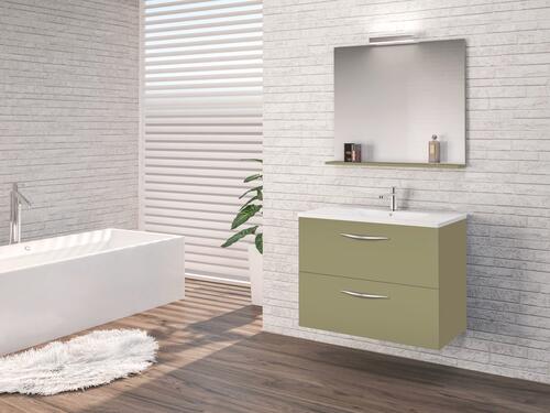 - Meuble à suspendre finition vert menthe, avec plan céramique blanc et vasque intégrée avec trop plein.