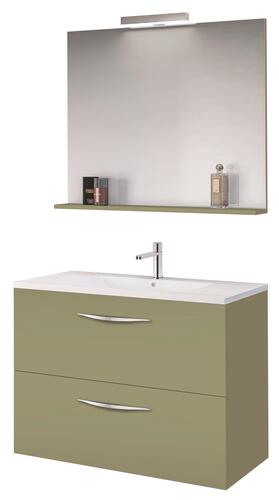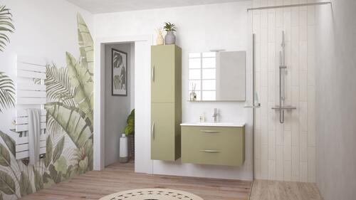 - Meuble à suspendre finition vert menthe, avec plan céramique blanc et vasque intégrée avec trop plein.