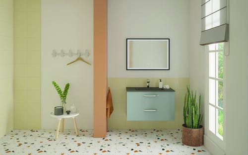 - Meuble à suspendre finition bleu bleuet, avec plan résine noir mat et vasque intégrée avec trop plein.