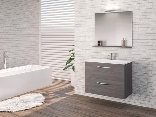 - Meuble à suspendre finition gris, avec plan céramique blanche simple vasque intégrée avec trop plein.