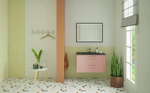 - Meuble à suspendre finition rose poudré, avec plan résine noir mat et vasque intégrée avec trop plein.
