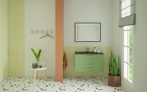 - Meuble à suspendre finition vert menthe, avec plan résine noir mat et vasque intégrée avec trop plein.