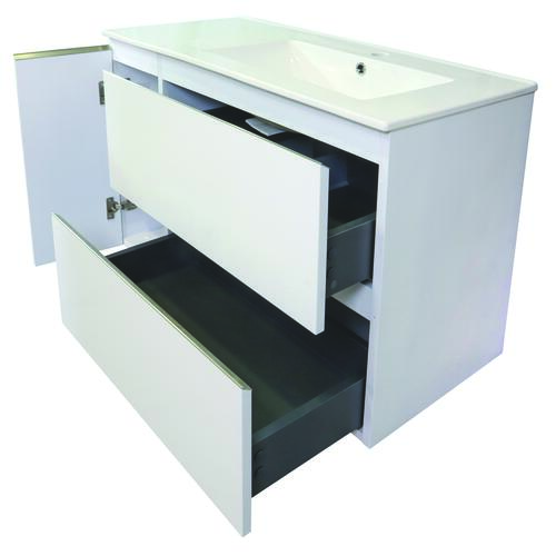 - Meuble à suspendre finition laquée blanc mat, avec plan vasque blanc céramique intégrée avec trop-plein.