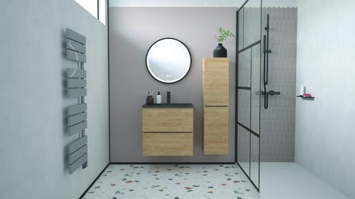 - Meuble à suspendre finition bois, avec plan vasque résine noir intégrée avec trop-plein.