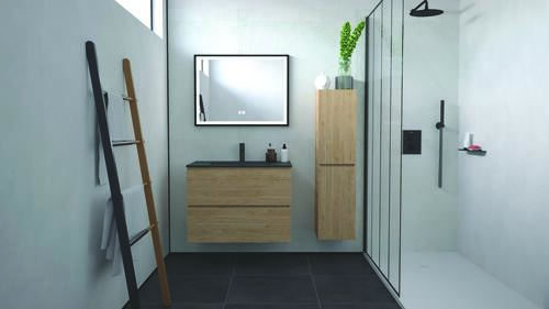 - Meuble à suspendre finition bois avec plan vasque résine noir intégrée avec trop-plein.