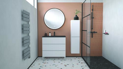 - Meuble à suspendre finition laquée blanc mat, avec plan vasque résine noir intégrée avec trop-plein.
