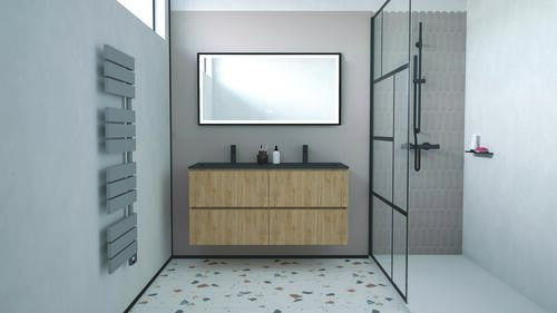 - Meuble à suspendre finition bois avec plan vasque résine noir intégrée avec trop-plein.