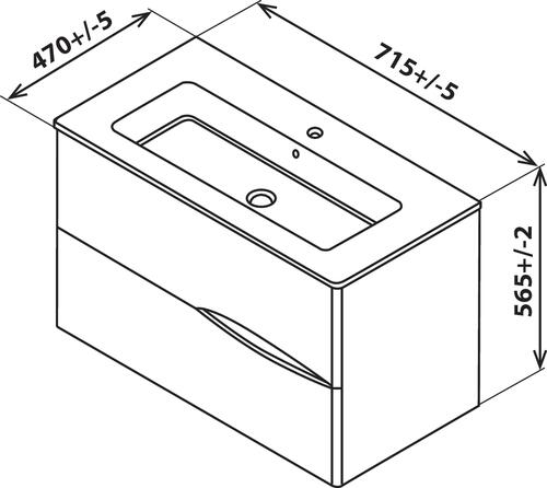 - Plan céramique extra plat épaisseur 18 mm à coins arrondis avec vasque moulée et trop plein.