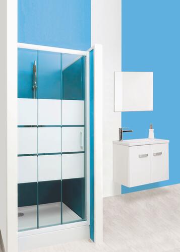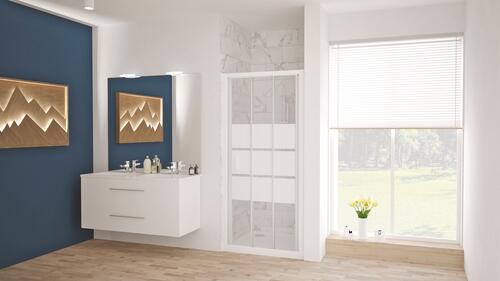 - 3 volets coulissants en verre trempé 4 mm avec sérigraphie 3 bandes peintes blanches.