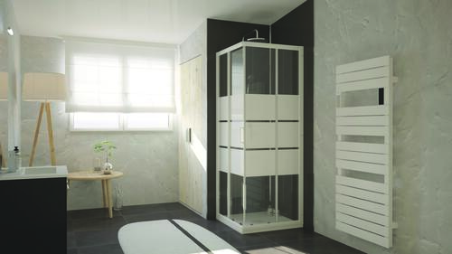 - 2 volets coulissants et 2 panneaux fixes en verre trempé 4 mm avec sérigraphie 3 bandes peintes blanches.